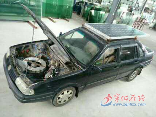 ??? 2014年10月,他網購了發電機、電動機、太陽能電板、電池等,又從汽車修理廠買來報廢的小轎車,開始做太陽能、風能電動小轎車。