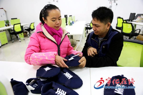 邱廷斌(右)與殘疾人一起做鞋面手工活。