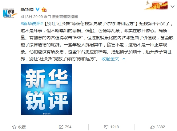 直播中的牌牌琦今年4月3日,新華網點名批評了“社會搖”,認為“社會搖”等低俗視頻晃散了年輕人的“詩和遠方”,讓他們沉溺其中,欲罷不能。