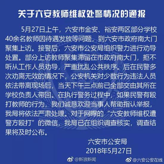 5月27日晚,六安市公安局官方微博發布《關于六安教師維權處警情況的通報》。通報稱,六安市金安、裕安兩區部分學校40余名教師因待遇發放等問題,到六安市政府南大門聚集上訪。接警后,六安市公安局組織警力進行勸導處置。部分上訪教師聚集滯留在市政府南大門,拒不聽從工作人員勸導,嚴重擾亂公共秩序。后在民警多次勸離無效的情況下,公安機關對少數行為違法人員依法帶離現場后,當天下午三點前已全部交由其所在學校負責人帶回。