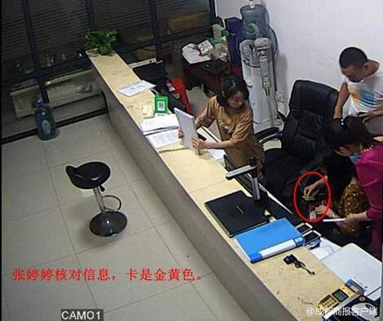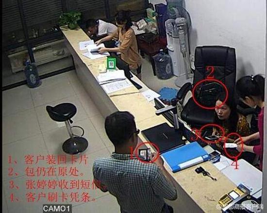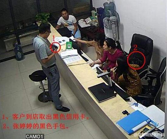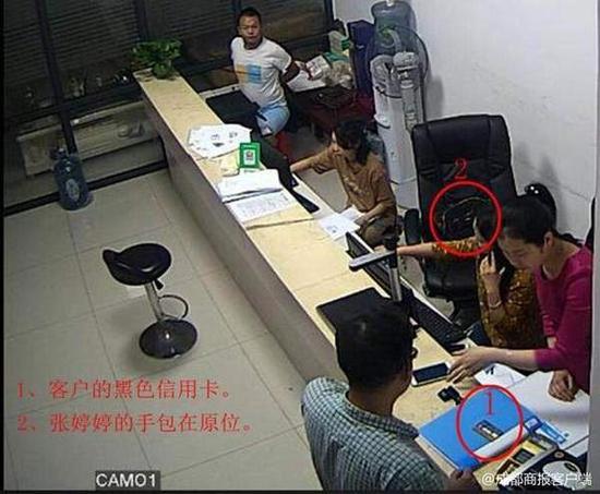 成都商報(bào)記者仔細(xì)觀看視頻,發(fā)現(xiàn)在整個(gè)刷卡過(guò)程中,柜臺(tái)內(nèi)四個(gè)人的工位沒(méi)有變化(小陳從座位到刷卡機(jī)位后也沒(méi)有變動(dòng)),張婷婷的包也在右側(cè)座椅上無(wú)人移動(dòng)。客戶給小陳的是黑色信用卡,從取卡插入刷卡機(jī)再到取卡,該卡的運(yùn)動(dòng)軌跡被監(jiān)控拍得清清楚楚;而張婷婷放在包里的,則是一張金色信用卡。