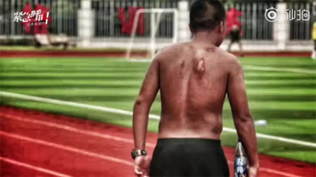 一名戰士坐在地上,黝黑的后背淌著汗水,一塊傷疤觸目驚心。