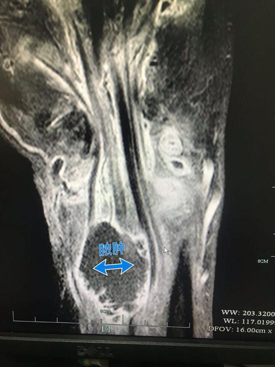 半年之后,姚先生找到了杭州的一家醫院,檢查顯示姚先生的右手腕持續流膿,伴隨著惡臭和疼痛,CT片顯示膿腫肌腱斷裂,醫生告訴姚先生,這種情況可能要截肢……