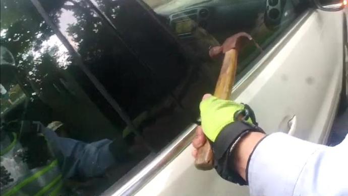 烈日暴曬的午后,粗心車主將兩歲大的女兒和車鑰匙都鎖在了車里。危急時刻,長寧公安分局交警支隊民警黃迎輝和警長張亮立即趕到現(xiàn)場,砸碎車窗成功救出被困女童。破窗前,細心的張亮還特意致電詢問專業(yè)人士,“砸哪塊玻璃既安全又便宜?”