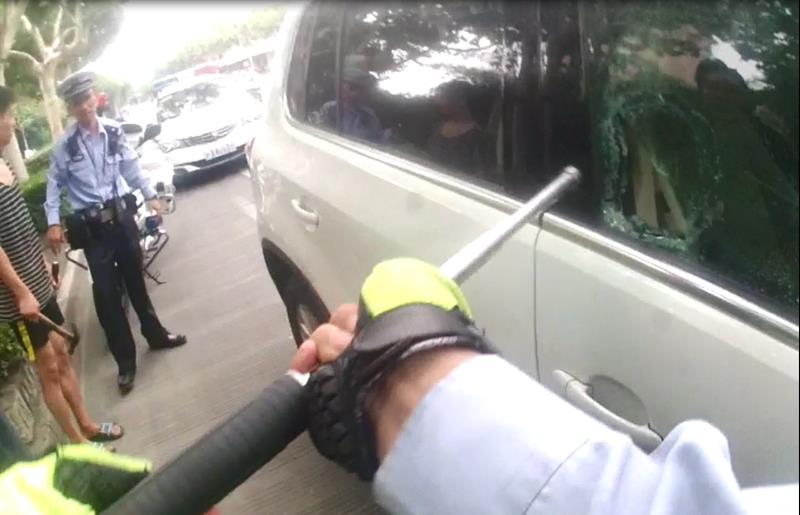 接到指揮中心通報后,交警三大隊警長張亮很快趕到現(xiàn)場增援。當時車輛熄火已有一段時間按,在太陽暴曬下,車內溫度會持續(xù)升高,時間拖得越久,女童越危險。由于車輛的備用鑰匙一時半會兒無法送至現(xiàn)場,在征得男子同意后,兩位民警決定砸車窗救人。