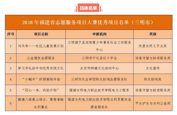 我市建寧縣“興未來(lái)——社區(qū)兒童發(fā)展計(jì)劃”、寧化縣“公益理發(fā)志愿服務(wù)”、永安市“學(xué)習(xí)并弘揚(yáng)中華優(yōu)秀傳統(tǒng)文化”、三明農(nóng)業(yè)學(xué)?!?小蝸牛'的朋輩陪伴者”、福建水利電力職業(yè)技術(shù)學(xué)院“四心一體 共助夕陽(yáng)”和“踏遍八閩青山綠水,青春奉獻(xiàn)水利事業(yè)”共六個(gè)項(xiàng)目入圍。