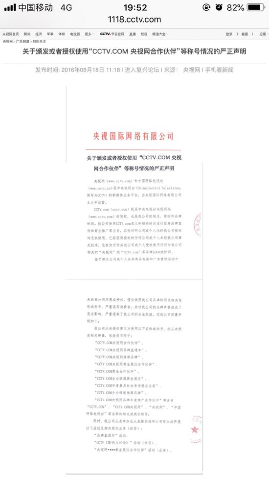不過,記者在央視網上查詢到,在2012年,中央電視臺廣告經營管理中心曾發布過一份關于從未頒布“央視上榜品牌”等稱號的聲明,2016年,央視國際網絡公司發出關于頒發或者授權使用“cctv.com央視網合作伙伴”等稱號情況的嚴正聲明,兩份聲明中表示未授權“央視網”或“cctv.com”等品牌,未授權第三方使用cctv.com央視網推薦品牌、品牌年度推廣合作伙伴等稱號,也未頒發cctv央視品牌、宣傳品牌等稱謂。