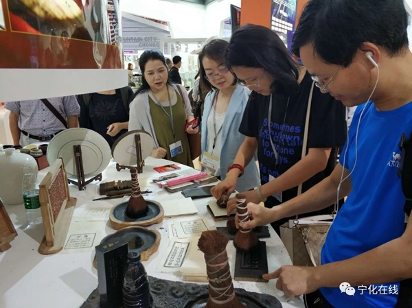 ▲前來觀展的深圳市民朋友紛紛來到寧化木活字印刷展臺前體驗這古老傳統技藝。