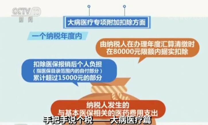 根據暫行辦法,在大病醫療專項附加扣除方面,一個納稅年度內納稅人發生的與基本醫保相關的醫藥費用支出,扣除醫保報銷后個人負擔(指職工醫保目錄范圍內的自付部分)累計超過15000元的部分,由納稅人在辦理年度匯算清繳時在8萬元限額內據實扣除。