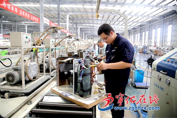 ? ? 9月20日,在寧化月兔科技有限公司生產車間內,工人正忙著給空調焊接封口。作為全省唯一空調整機生產項目、三明市首個白色家電生產項目,月兔空調2018年產銷目標保底80萬套,爭取完成100萬套。1至9月,公司已完成空調生產70萬套,完成工業產值10億元,實現產銷兩旺。(本報寧化記者站 范日樑 攝)