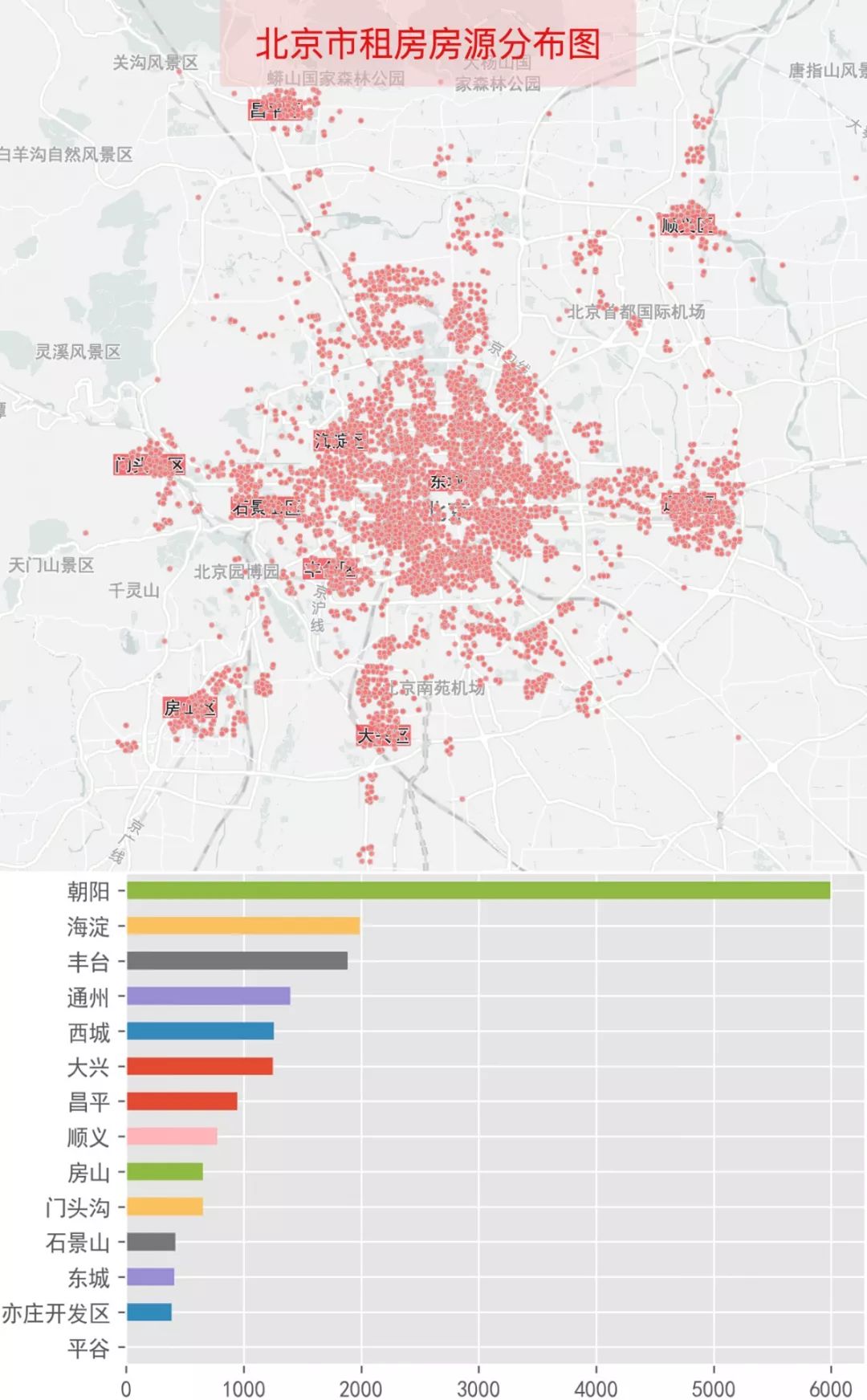 我們把北上廣深四個城市的房源都以小點的形式投射在地圖上,先來看看北京的。