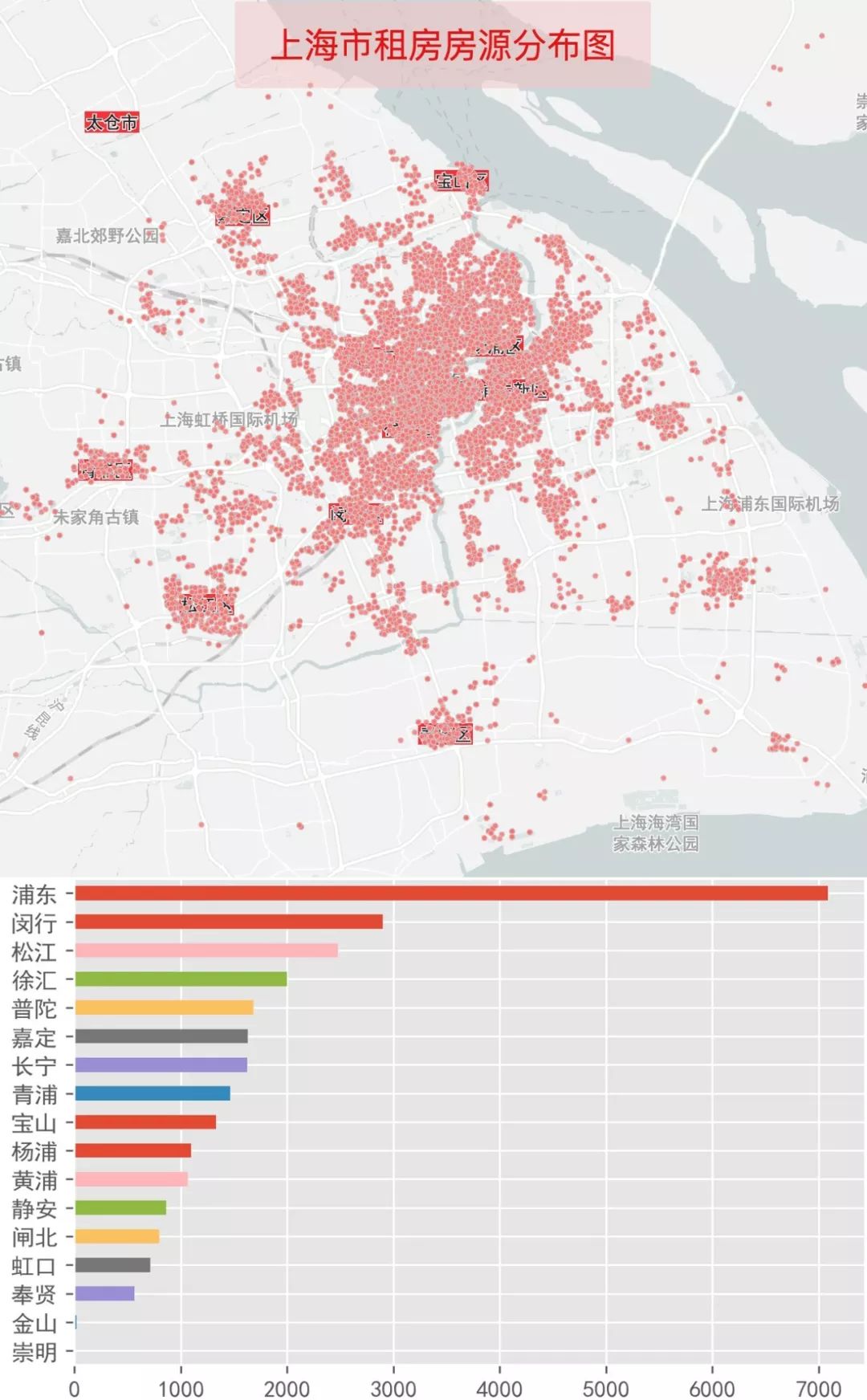 上海也一樣,除了周邊的寶山、嘉定、青浦、松江、奉賢等區中心有房源外,房源主要集中在中心城區+浦東(地鐵網范圍內)。總共27311條房源,浦東就有7000多條,比例超過1/4。