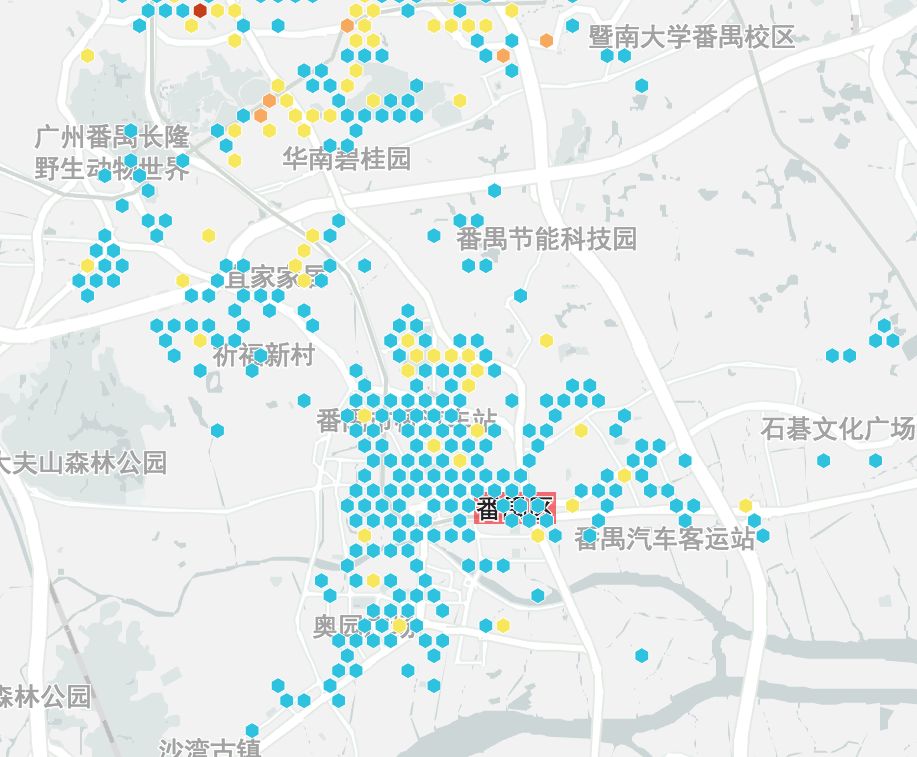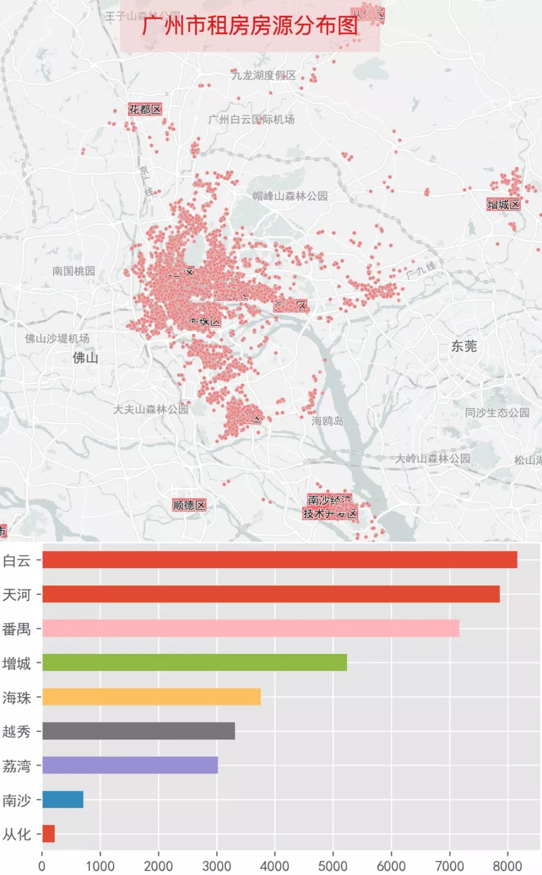 廣州房源在四個城市中是最多的,共有39457條,主要集中在白云、天河、越秀、荔灣,以及海珠和番禺。其中白云、天河和番禺房源都超過6000條,選擇豐富,不過看圖也知道,3號線通勤壓力巨大。