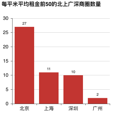 按商圈來看,每平米平均租金前50的商圈中,北京就占了27個,上海和深圳分別是11和10個,廣州最少,只有2個。