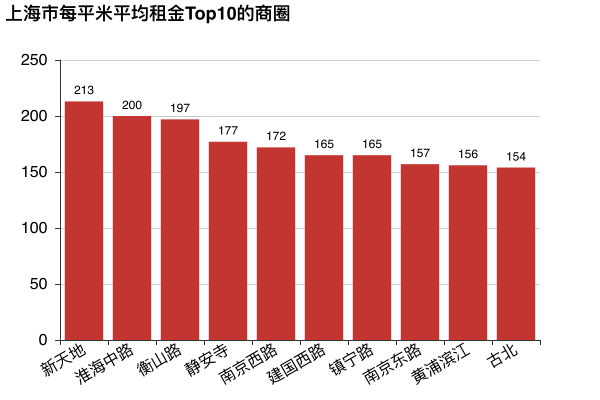 上海每平米平均租金前10的商圈較北京要好一些,租金在170元左右徘徊。其中租金最高的商圈新天地,每平米租金為213元。