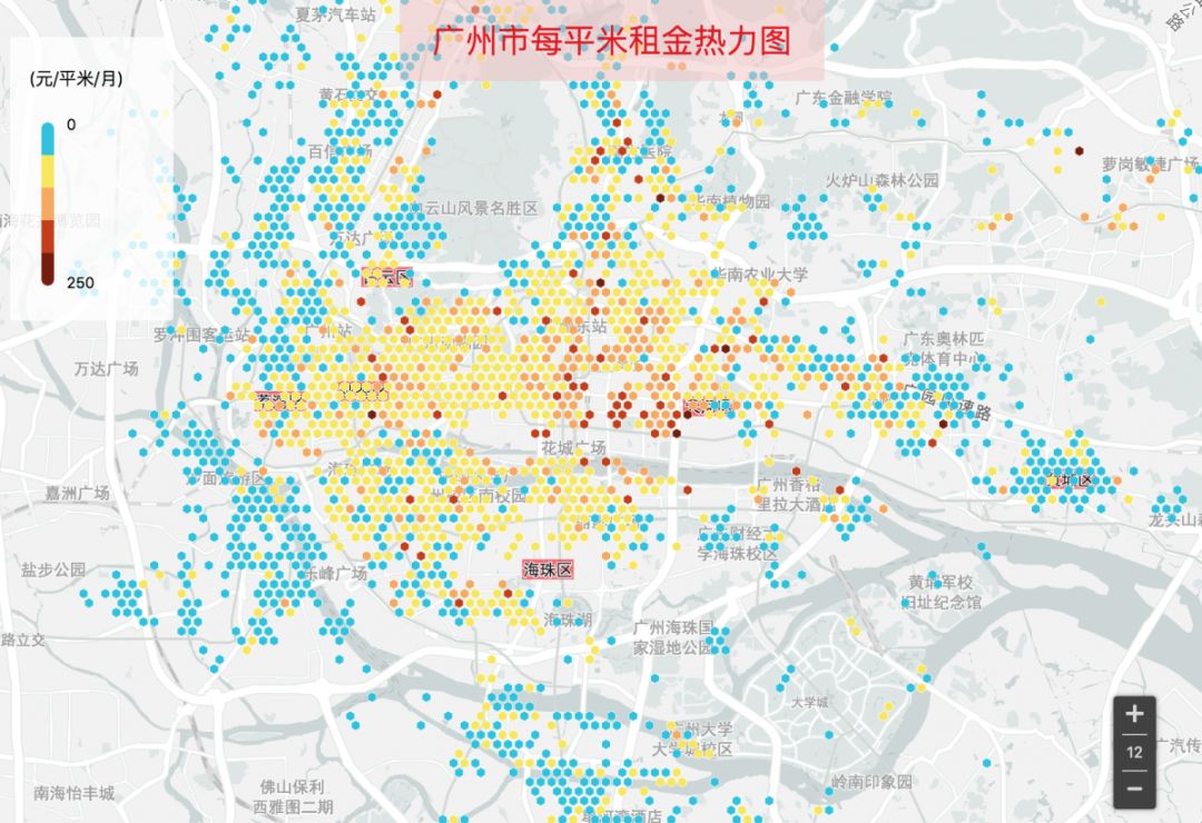 相較北京和上海,廣州每平米月租金明顯以100元以下的房源占主導。100元以上的比較零星,主要分布在體育中心、跑馬場、以及崗頂站周圍,荔灣、越秀中心也有一些。看來廣州還是一個租房比較友好的城市啊。