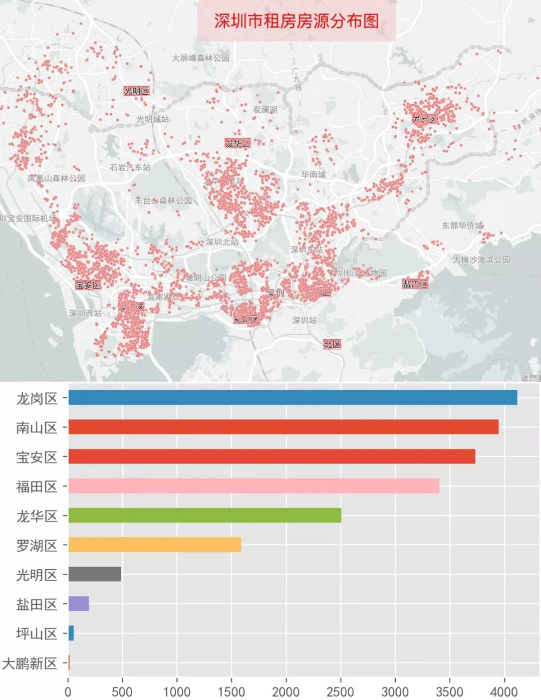 深圳的房源共有20054條,更集中在各區,除了四個新區零星分布的房源外,主要還是分布在寶安、南山(科技園)、福田、羅湖、龍崗區中心,以及坂田、布吉、3號線沿線,11號線沿線(是市中心的租金太貴了吧?)