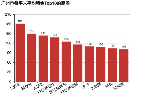 廣州前10的商圈每平米月租金相較北京上海也是整體便宜。最貴的是越秀的二沙島181元,以及解放北和人民北,再者是天河的珠江新城。
