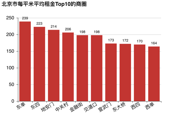 北京每平米平均租金前10的商圈,租金在每平米200元左右徘徊。最貴的商圈東單,每平米要239元,也就意味著,在東單租一個30平的房子,一個月需要7170塊錢,租一個80平的房子,一個月需要19120元。