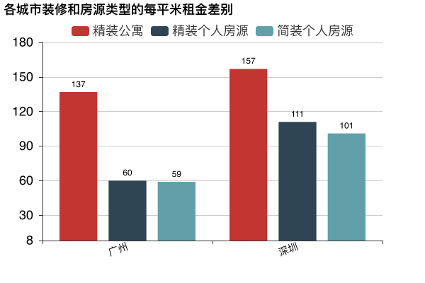 可以看到,在廣州和深圳,精裝公寓都是要比個人房源貴上很多的。廣州個人房源精裝和簡裝租金幾乎無差別,但精裝公寓比精裝個人房源每平米租金要貴上77元(一倍不止)!深圳要貴46元。也就是說,在廣州租一個20平的房子,精裝公寓要比個人房源貴上1540元!