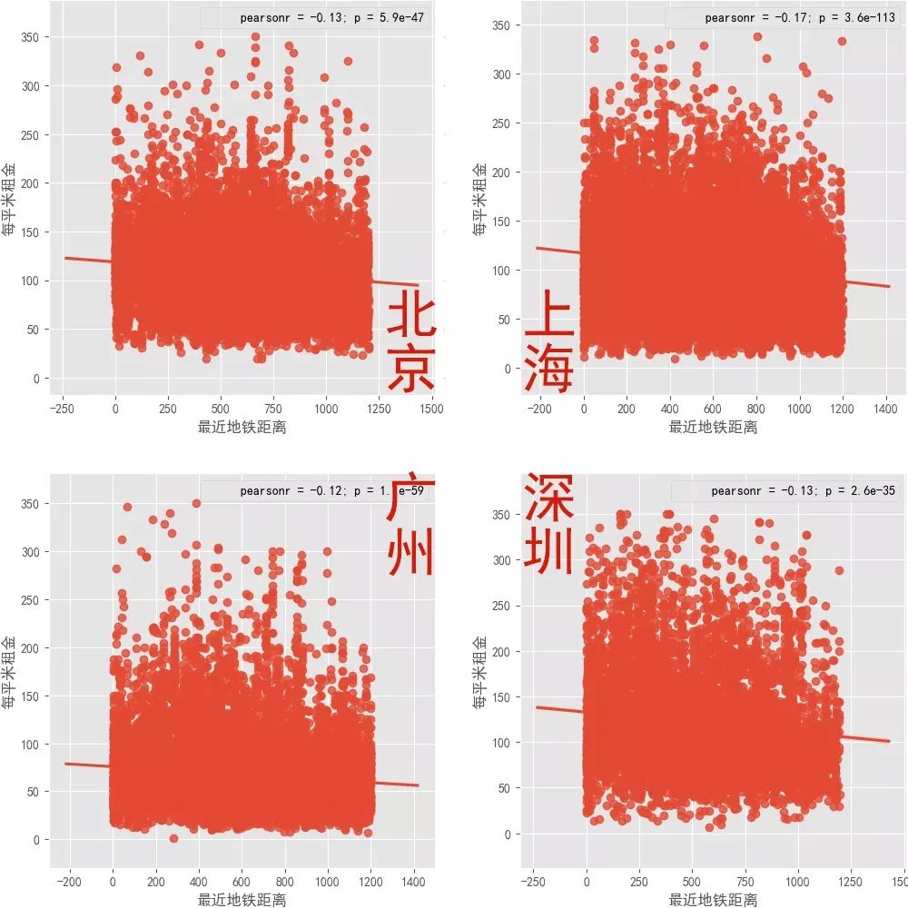 租房,其中一個終點考慮的因素就是距離地鐵的遠近。我們把個城市房源距離最近地鐵站的距離跟每平米租金進行了回歸分析,并且計算了相關系數。