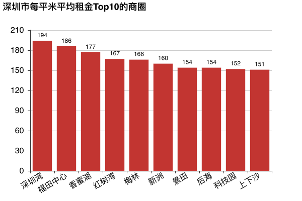 再看前10的商圈,果然深圳灣以每平米租金194元領先,然后是福田中心和香蜜湖。