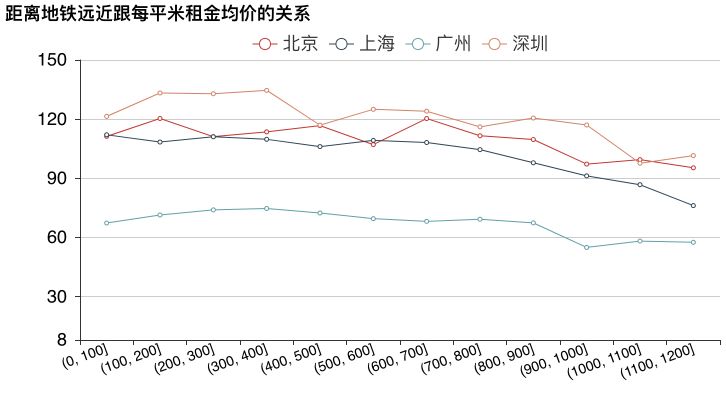 廣州市每平米租金明顯比其它城市低。同樣,只要地鐵在900以內,租金變化不大。900米和1000米租金差距為12元。