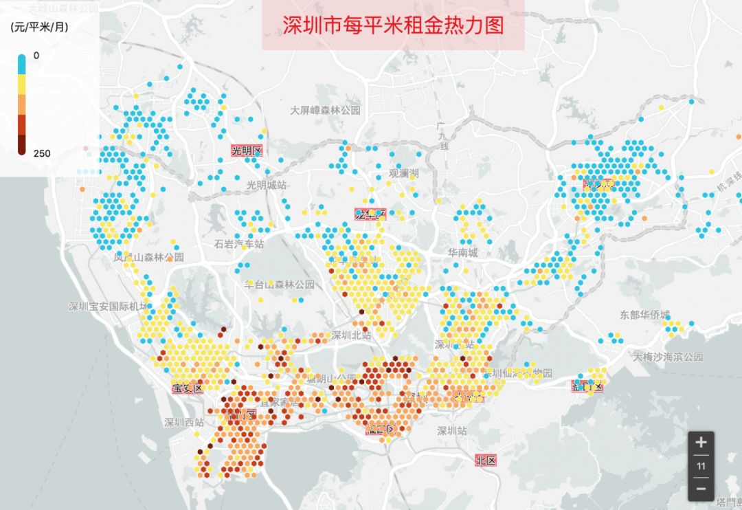 深圳每平米租金大于100元的房源主要集中在南山區(深大、深圳灣、科技園)、福田區(特別是梅林和香蜜湖)、以及羅湖區。寶安、龍華、布吉主要以每平米租金50-100元為主,11號線碧頭端以及龍崗區主要以每平米租金50元以內為主(是不是有很多小伙伴愿意租在這里,搭地鐵去市區上班的?)。