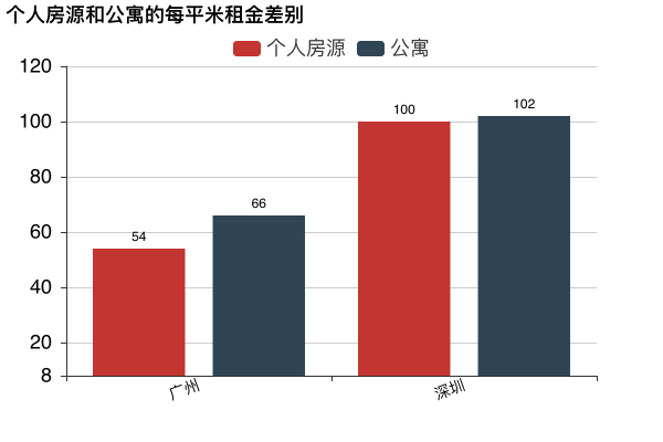 廣州和深圳公寓數量占總房源數量的20%和51%(深圳怎么那么多公寓?)。可見廣州和深圳公寓都要比個人房源貴一些,廣州平均每平米貴12元,深圳貴2元。