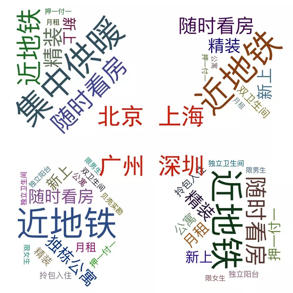 最后,我們對每個房源的標簽進行了統計,并且繪制了詞云圖,可以看出各城市租房時思考的側重點。