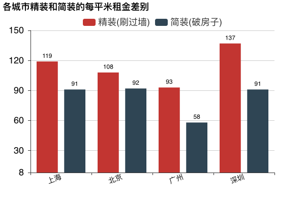 可以看到,北上廣深精裝的房子比簡裝的房子平均每平米租金要分別貴:28、16、35、46元。深圳的精簡裝差別最大。也就是說,在深圳租一個20平精裝的房子要比簡裝的貴上920元!