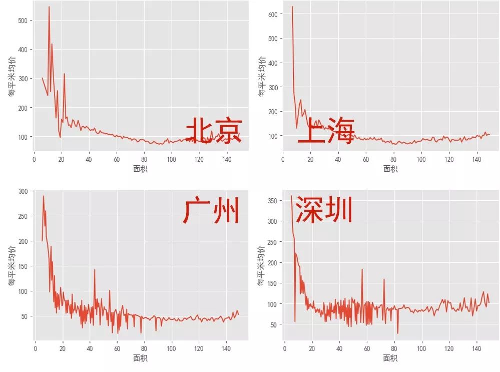我們把各城市房源的面積和每平米均價繪制出關系圖。可以看到,不管是哪個城市,出租面積在15平米以內的房子每平米租金都是最貴的,當然這里不排除租金貴的區域有更多單獨出租的小房間這個原因。但是還是可以看出來,如果有認識的好友一起租大房子,不僅每平米的租金更便宜,而且還可以有一個大點的公用客廳。