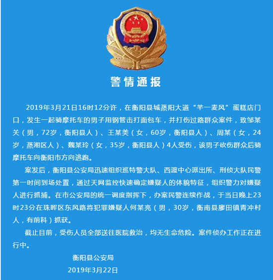 2019年3月21日16時12分許,在衡陽縣城蒸陽大道“芊一麥風”蛋糕店門口,發(fā)生一起騎摩托車的男子用鋼管擊打面包車,并打傷過路群眾案件,致鄒某關(guān)(男,72歲,衡陽縣人)、王某美(女,60歲,衡陽縣人)、周某(女,24歲,蒸湘區(qū)人)、魏某玲(女,35歲,衡陽縣人)4人受傷,該男子砍傷群眾后騎摩托車向衡陽市方向逃跑。