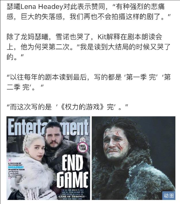 Kit更是在劇本朗讀會上連哭兩次,Kit稱:“以往每年的劇本讀到最后,寫的都是‘第一季完’,‘第二季完’而這次寫的是‘《權力的游戲》完’。”