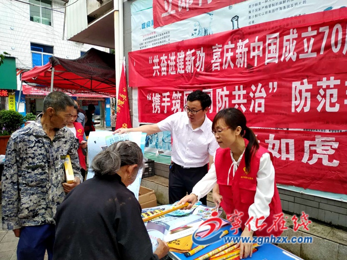 ? ? 5月28日上午,由寧化縣湖村鎮綜治辦、計生協會、團委、司法所、衛生院等多個部門聯合組成的新時代文明實踐志愿服務隊,在集鎮八角亭開展“共奮進建新功,喜慶新中國成立70周年”主題宣傳活動。