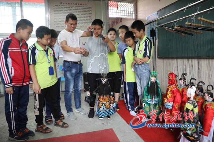 水茜中心學(xué)校楊榮高老師跟著賴家麒學(xué)習(xí)木偶戲表演,轉(zhuǎn)而教學(xué)生練習(xí)。師生們從拉、提、勾、夾、挑、轉(zhuǎn)等技巧學(xué)起,逐漸掌握了提線木偶戲的技巧。通過手中一根根柔軟的線,伴以吹拉彈唱、勾挑提拉,一個個沒有生命的木偶角色,在他們靈巧的雙手中飛天遁地、舞刀弄槍,栩栩如生。
