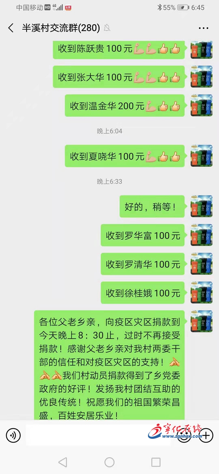 當天下午,廖福林在半溪村交流群里簡單地發了個倡議:一方有難,八方支援,希望全體村民有錢出錢、有物出物,為抗擊疫情獻上一份力。消息一出,群聊被“向武漢捐款”的紅包刷屏了,大伙你100元、他200元,紛紛響應。身患重病的村民曾縣強也捐了100元表達他的心意。