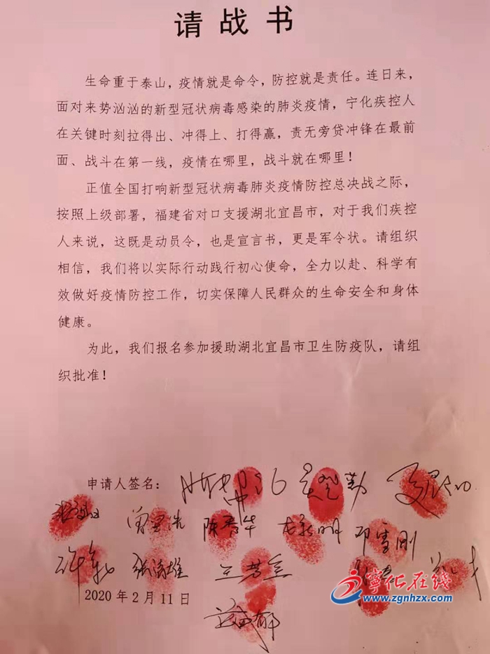 2月11日晚,寧化縣疾控中心微信工作群里發出報名參加援助湖北宜昌市衛生防疫隊的通知。隨后,縣疾控中心14名專業技術人員在微信群里集體上交“請戰書”,爭赴戰“疫”一線。