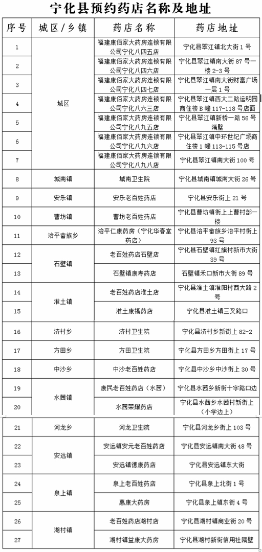 為方便群眾,在城區(qū)和各鄉(xiāng)鎮(zhèn)指定以下單位為口罩配售點,供中簽的寧化城鄉(xiāng)居民選擇: