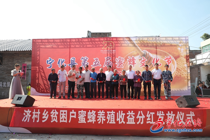 在三村黨支部的引領(lǐng)下,施河林為周邊村民提供引進新品種、蜂藥、蜂具、蜂食、蜂產(chǎn)品購銷等服務(wù),開展養(yǎng)殖技術(shù)培訓(xùn)、交流和咨詢等,不斷推行“互聯(lián)網(wǎng)+私人定制”模式,讓濟村的蜂蜜向個性化發(fā)展。通過發(fā)展養(yǎng)蜂產(chǎn)業(yè),會員獲得分紅或勞務(wù)收入,人均增收3000多元。2015年以來,施河林連續(xù)籌辦五屆蜜蜂文化節(jié),帶動養(yǎng)蜂產(chǎn)業(yè)的發(fā)展。2019年10月,三村如期舉辦第五屆蜂蜜文化節(jié)暨電商扶貧助農(nóng)簽約儀式,10名參與蜂群代養(yǎng)的農(nóng)戶喜獲合作社收益分紅,6家電商企業(yè)與東華山養(yǎng)蜂專業(yè)合作社簽約,就建檔立卡貧困戶的蜂產(chǎn)品及其它農(nóng)特產(chǎn)品的銷售達成合作協(xié)議。