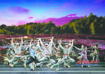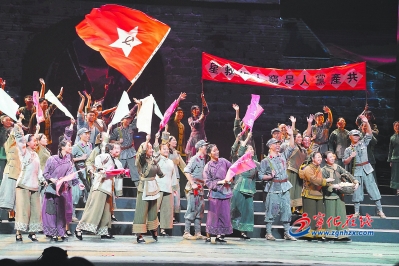 當年,三明作為中央蘇區重要的物質保障基地,在支前、擴紅等戰略層面為中國革命的勝利付出了巨大犧牲,作出了重要貢獻。特別是以六千閩籍子弟、三千寧化兒郎為主的紅軍第三十四師,為掩護中央紅軍縱隊突圍,與數量十幾倍于自己的國民黨反動派激戰,最終血染湘江,用熱血和生命書寫了可歌可泣的壯麗詩篇。由此,以蘇區故事和湘江戰役為背景,《風展紅旗如畫》塑造了以客家兒女為代表的三明蘇區英雄兒女形象,從入農會、挖蓮塘到擴紅、支前,再到長征出發、血戰湘江,舞臺上的每個片段、每個人物,都令觀眾感到親切與自豪。