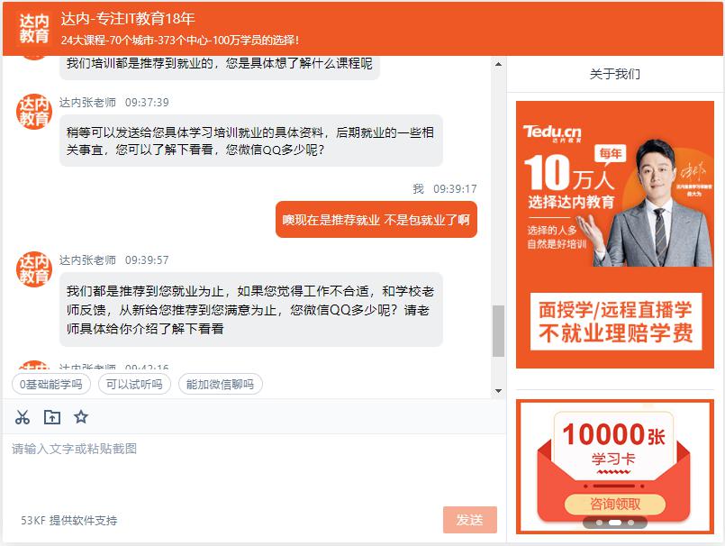 中新經(jīng)緯客戶端以學(xué)員身份就此向達(dá)內(nèi)教育客服咨詢,客服稱,培訓(xùn)都是推薦到就業(yè)的。“都是推薦到您就業(yè)為止,如果您覺得工作不合適,和學(xué)校老師反饋,重新給您推薦到您滿意為止。”達(dá)內(nèi)教育客服稱。但對(duì)于能否賠付學(xué)費(fèi)的問題,客服始終沒有正面回答。