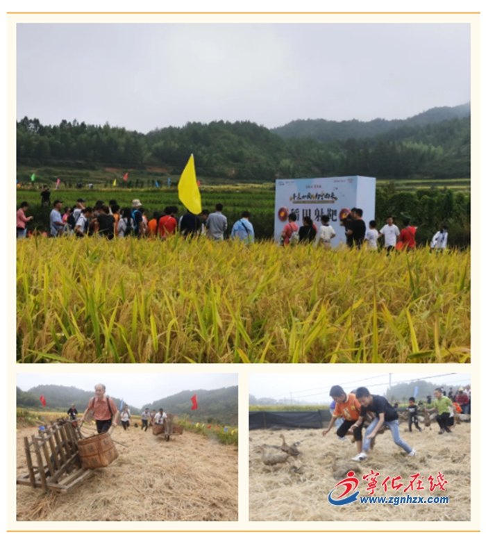 現場還舉行了趣味農事豐收大作戰體驗活動。在河龍貢米收割大比拼活動中,游客參加手動脫禾粒、獨輪車運糧等傳統的稻谷收割農事體驗活動。趣捉稻鴨活動,游客們徒手在稻田里抓鴨子,你追我趕,體驗趕鴨、捉鴨的歡樂。稻田射靶比賽、垂釣小龍蝦等活動,參賽選手個個神情專注,享受活動帶來的樂趣。