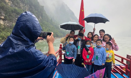 游客們在景區游船上合影留念。人民網 余璐 攝