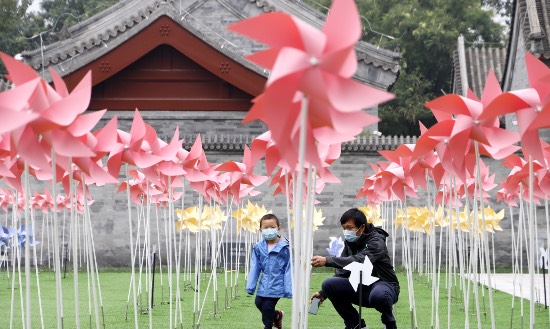 景區裝點的風車吸引著孩子的注意。人民網 鄂智超 攝