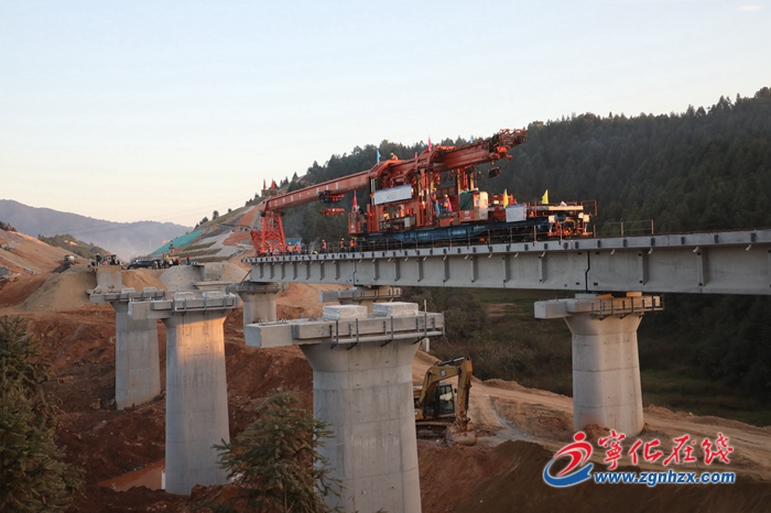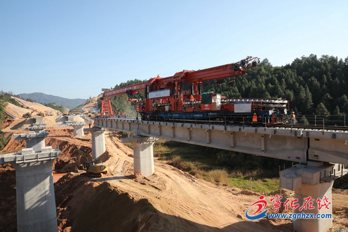 ? 11月5日17時50分,在寧化境內(nèi)的上龍大橋鋪架施工現(xiàn)場,隨著中鐵十一局建設(shè)者將最后一片32米的T梁穩(wěn)穩(wěn)落下,標(biāo)志著浦梅鐵路127座橋梁的架設(shè)工作全部完成,全線架梁貫通,為后續(xù)鋪軌施工創(chuàng)造有利條件。