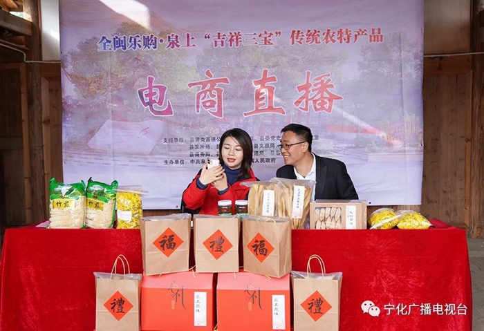 外邊廣場上是熱鬧的歌舞演出,里邊紀(jì)念館左側(cè)戲臺搭建的直播間里,泉上“吉祥三寶”傳統(tǒng)農(nóng)特產(chǎn)品電商直播也在進(jìn)行著。泉上鎮(zhèn)和縣融媒體中心的工作人員向直播間里的觀眾們逐一推介泉上豆腐皮、孔坑貢茶、竹蓀、姬松茸、土蜂蜜、金絲皇菊茶等本地農(nóng)特產(chǎn)品。直播吸引了約8000人次的觀看,留言區(qū)粉絲們熱情高漲,積極參與互動,取得了良好的傳播效應(yīng)。
