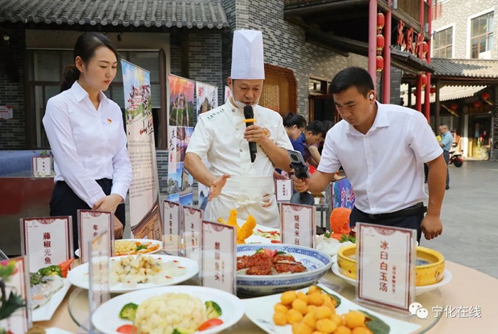 “廚師看見自己做的菜如此受歡迎,回到濟(jì)村新田后便做了一大桌的松鼠魚,分給村民們品嘗,因外觀金黃,且形如盔甲,并取名為‘冰臼黃金甲’。” 白斬貢雞、生魚片、冰臼白玉湯、冰臼黃金甲...... 一道道色香味齊全的特色菜陳列在展臺(tái),濟(jì)村鄉(xiāng)新田村駐村第一書記鄢偉現(xiàn)場一一介紹菜品特色和典故。