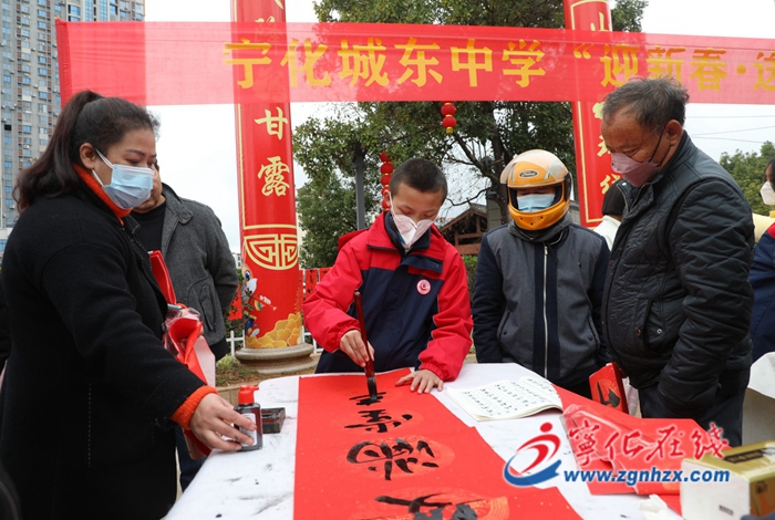 1月10日,寧化縣校外活動中心及實驗小學、寧師附小、寧化六中、城東中學等14所城區中小學的200余名師生志愿者兵分8路,在社區、廣場、超市門前等地,為廣大群眾寫春聯,送上新春祝福。