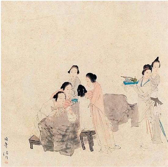 《乞巧圖》這種畫,歷史悠久,源遠流長。只有外表形式變化,內容基本穩定。幾個姑娘一碗水,斗斗花針扯扯嘴。無非如此。這可是也真能說明中國人生活狀態的穩定性——從唐代到近現代沒大變化。作為民俗畫來說,“乞巧圖”有一定意義。雖然也許到了近現代,不一定真的任何什么地方都興這么玩兒。可是,至少好古之風下,大家知道這一回事。還總是拿它應七月七的景兒。所謂外表變化,我們可以看看清末海派的任伯年先生畫的《乞巧圖》,至少不像上面那種“工筆”了。
